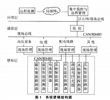 智能化監(jiān)控系統(tǒng)基于嵌入式軟硬件平臺(tái),嚴(yán)格遵從“設(shè)備智能化、系統(tǒng)網(wǎng)絡(luò)化、狀態(tài)信息化、安全可視化”的產(chǎn)品定位,構(gòu)建一體化分布式電氣火災(zāi)智能化綜合監(jiān)控系統(tǒng)。系統(tǒng)架構(gòu)基于物聯(lián)網(wǎng)系統(tǒng)模型及B/s軟件體系,按照“感知層、通信層、應(yīng)用層”標(biāo)準(zhǔn)實(shí)施系統(tǒng)建模。系統(tǒng)組成具體包括:處于感知層的電氣火災(zāi)監(jiān)控探測器、無線溫度探測器、分布式感溫光纜等;處于網(wǎng)絡(luò)層的通信網(wǎng)絡(luò)、現(xiàn)場總線及實(shí)現(xiàn)區(qū)域監(jiān)測管理功能的監(jiān)控器等;處于應(yīng)用層的監(jiān)控設(shè)備、遠(yuǎn)程監(jiān)控中心及客戶終端等。系統(tǒng)邏輯結(jié)構(gòu),如圖1所示。