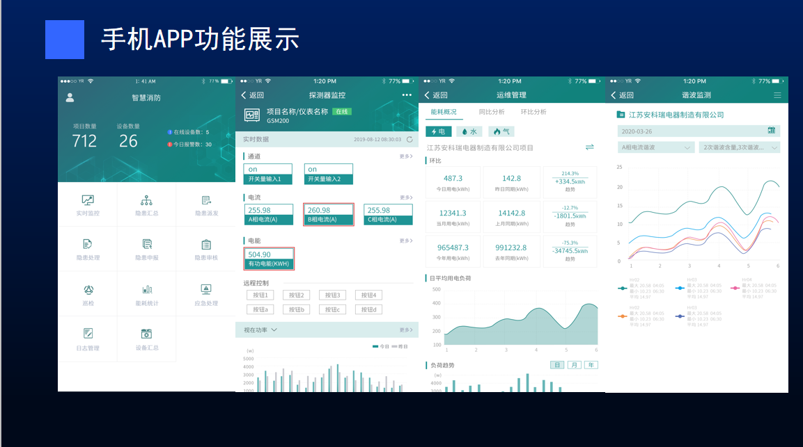 手機(jī)APP軟件具有IOS版本和安卓版本,并與電腦終端系統(tǒng)的數(shù)據(jù)同步,能展示剩余電流、溫度、電壓、電流等電氣安全參數(shù)的實(shí)時(shí)監(jiān)測數(shù)據(jù)及變化曲線、歷史數(shù)據(jù)與變化曲線;短路、斷線、漏電、超溫、過壓、欠壓、過流等電氣故障實(shí)時(shí)報(bào)警數(shù)據(jù)等;能實(shí)時(shí)顯示項(xiàng)目地理位置、未排除隱患數(shù)、未處理巡檢數(shù)等;通過APP消息推送的方式提醒用戶實(shí)時(shí)報(bào)警信息;可以實(shí)現(xiàn)遠(yuǎn)程復(fù)位、遠(yuǎn)程分閘功能;可以對(duì)所有現(xiàn)場探測器進(jìn)行遠(yuǎn)程參數(shù)設(shè)定及修改;可以對(duì)所有現(xiàn)場探測器的遠(yuǎn)程控制記錄進(jìn)行查詢;