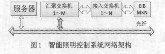 系統(tǒng)的組網(wǎng)采用支/干線模式,其中的支線連接由KNX控制總線完成,干線連接依托館所現(xiàn)有局域網(wǎng)實現(xiàn),該局域網(wǎng)連通館內(nèi)全部控制器,不用另行敷設(shè)電纜和重復(fù)定義系統(tǒng)管控方式。依托KNX/IP網(wǎng)關(guān)優(yōu)勢就能夠方便地實現(xiàn)將本系統(tǒng)接入校園主干網(wǎng),實現(xiàn)遠程的服務(wù)器連網(wǎng)。智能照明控制系統(tǒng)網(wǎng)絡(luò)架構(gòu)如圖1所示。