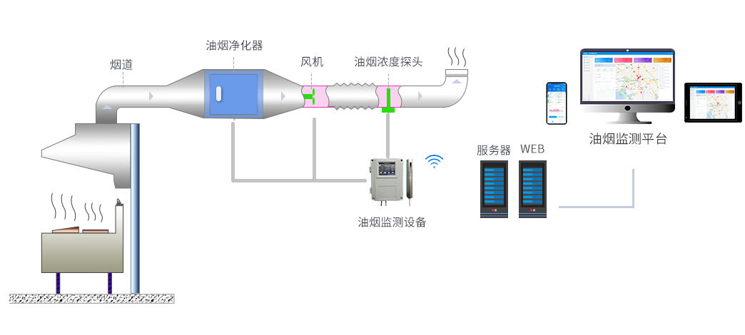 對油煙排污數(shù)據(jù)的監(jiān)測,包括油煙排放濃度,顆粒物,NmHc等數(shù)值采集監(jiān)測;同時對監(jiān)控風(fēng)機和凈化器的啟停狀態(tài)、運行數(shù)據(jù)進行監(jiān)測。