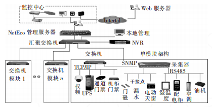微模塊數(shù)據(jù)中心的機房管理采用 NetEco 基礎(chǔ)設(shè)施管理系統(tǒng),此系統(tǒng)由管理軟件和其他部件構(gòu)成,實現(xiàn)了對數(shù)據(jù)中心的溫濕度、空調(diào)系統(tǒng)、供配電系 統(tǒng)、UPS 后備電源、消防及監(jiān)控等多系統(tǒng)的數(shù)據(jù)采集與監(jiān)控,將各子系統(tǒng)和分散環(huán)節(jié)集中統(tǒng)一管理,為智 能化微模塊數(shù)據(jù)中心的全系統(tǒng)監(jiān)控提供了可靠保 障。NetEco 管理系統(tǒng)架構(gòu)圖如圖 3 所示。